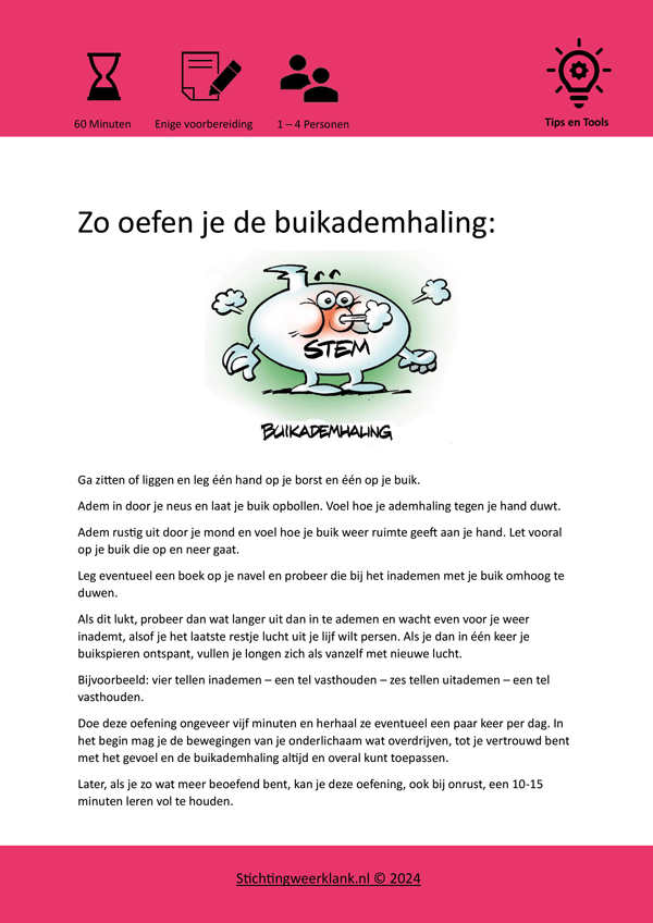 In de kaartenbak zit bij de roze ‘tips en tools kaarten’ een kaart die gaat over buikademhaling (zie kaart). Hier wordt precies beschreven hoe je zelf zo’n buikademoefening kunt doen.